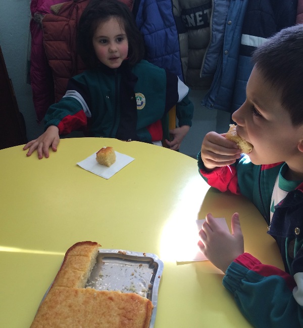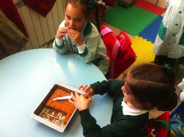 Utilizando los frutos que han traído los niños hemos hecho un taller de cocina y elaborado un rico bizcocho de almendras que encantó a los niños.